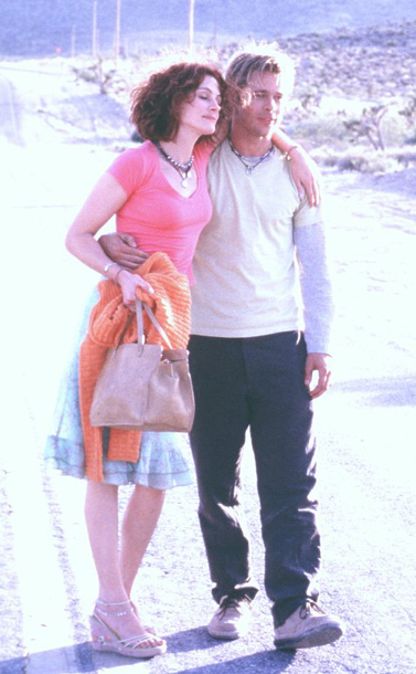 Career incompetent Brad Pitt has spent several years as an accidentprone Mob errand boy, trying unsuccessfully to work off the debt he incurred when, in a typical lapse, he sideswiped the car of Mister Big [Gene Hackman, actually, but we only find this out toward the end] and inadvertently allowed the police to discover a body in the trunk trying unsuccessfully, since, as the Deputy Boss hastens to point out, he fucks up every job they assign him. But this time for sure: Pitt is dispatched to a seedy bar in a small town in the Mexican outback to recover a rare and valuable pistol; which, it develops, carries a curse acquired when the gunsmith who made it tried to marry his beautiful daughter off to an asshole nobleman and not her poor but deserving true love. [Or something like that; the backstory develops in several installments of flashback, and doesnt take reliable shape until the penultimate crisis.] Naturally Pitts luck is no better on this expedition than on any previous, but while hes bungling the mission the several factions intent on obtaining the pistol for their own nefarious purposes, erring on the side of optimism, contend for possession of his estranged girlfriend Julia Roberts, who, though she has decided to write him off as a loss and seek her fortune in Las Vegas, seems plausible as a hostage; after a violent dispute over right of possession is resolved in his favor, she ends up taking an extended road trip with gay hitman James Gandolfini with whom, the names above the title notwithstanding, she develops the most interesting relationship in the picture, disarming his presumably predatory nature with an avalanche of psychobabble and absorbing in turn a renewed faith in the power of Love. Pitt, in the meantime, rockets rather aimlessly up and down the Mexican blue highways in an antique pickup, accompanied by a familiar spirit which has taken the form of a junkyard dog. In due course the parted lovers are reunited to quarrel through the [suitably protracted] final chase; and, after a very clever series of surprises, reversals, discoveries, and, naturally, carchases and gunfights, Love [and Star Power] triumph over all, the pistol is restored to its rightful owner, and the viewer is persuaded of the virtues of fleabag hotels, battered old cars, and Manly Love.